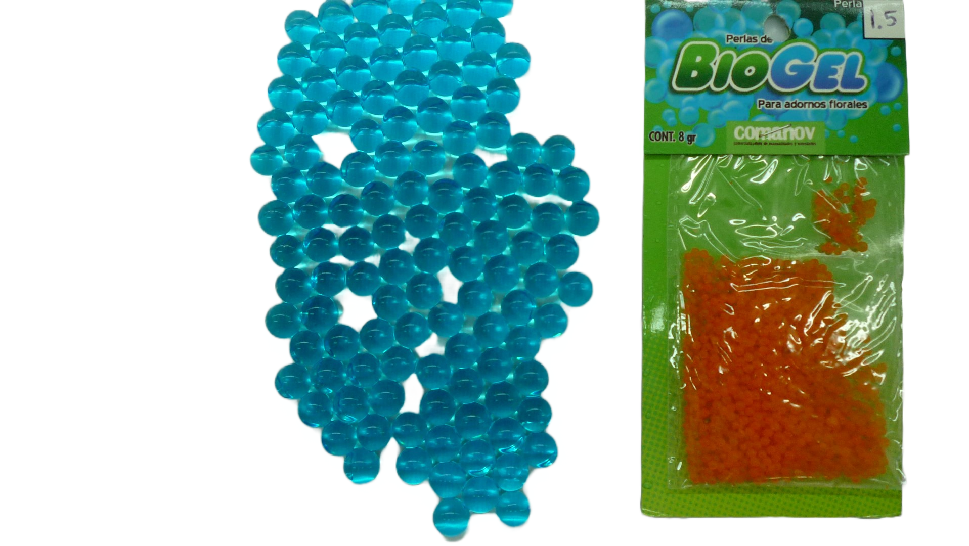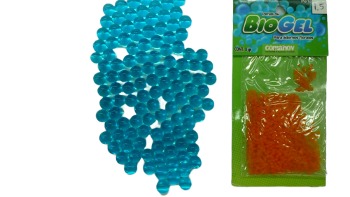 COLORES: AMARILLO, AZUL CIELO, AZUL OBSCURO, MORADO, NARANJA, ROJO, ROSA, TRANSPARENTE Y VERDE. RIENDA PARA 1LT DE AGUA. SE DEBE DE DEJAR DURANTE 8HR EN AGUA PARA QUE SE HAGAN GRANDES LAS BOLITAS DE GEL. EMPAQUE INTERNO 12 PIEZAS. CARTON CON 2880 PIEZAS.