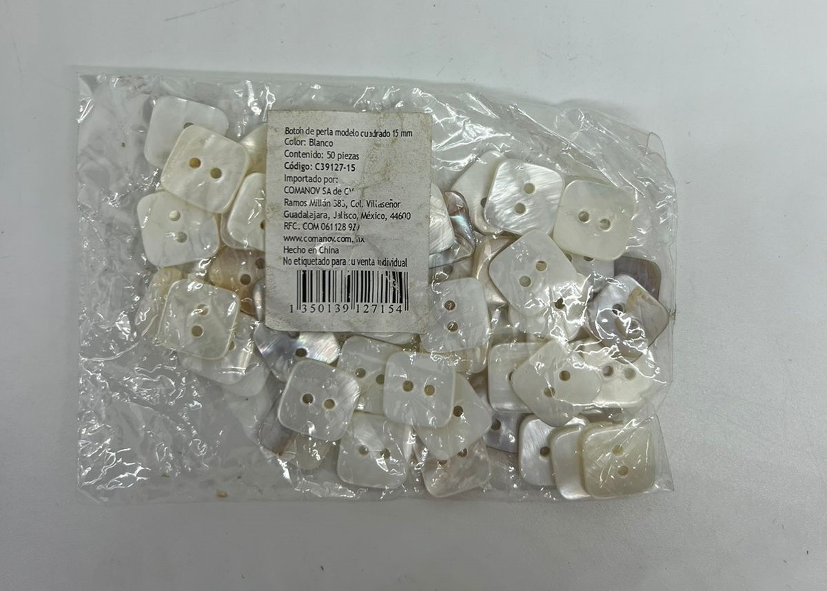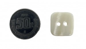 BOTON CONCHA BLANCO CUADRADO CON 2 OJOS 15MM TAM # 24 C-50. CARTON CON 300 BOLSAS DE 50 PIEZAS.