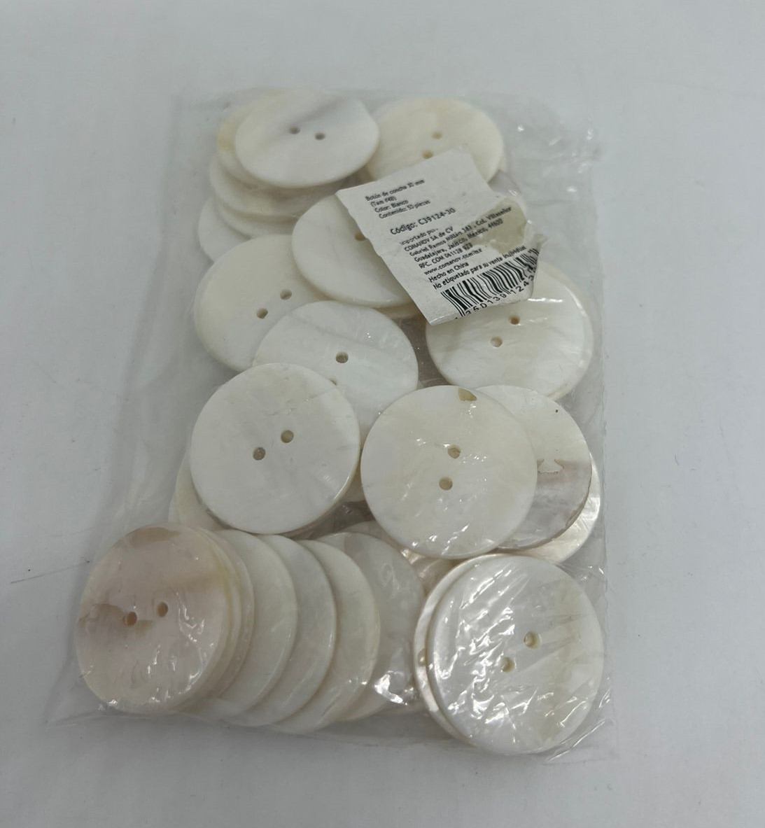 BOTON CONCHA BLANCO REDONDO CON 2 OJOS 30MM TAM # 48 C-50. CARTON CON 100 BOLSAS DE 50 PIEZAS.