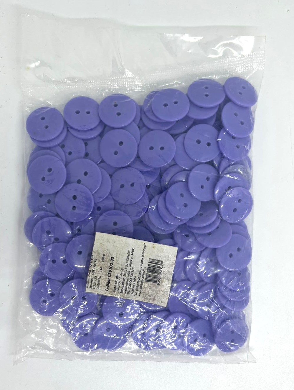 COLORES: AMARILLO, AQUA, AZUL CIELO, AZUL MARINO, AZUL MARINO CLARO, AZUL REY, AZUL TURQUESA, BEIGE, BLANCO, BUGAMBILIA, CAFE CLARO, CAFE OBSCURO, CHEDRON, CORAL, GRIS OBSCURO, GRIS RATA, HUESO, LILA, MANDARINA, MORADO, NARANJA, NEGRO, PAPAYA, ROJO, ROJO OBSCURO, ROSA, . ROSA CLARO, FUCSIA, UVA, VERDE BANDERA, VERDE LIMON Y VINO . BOTON PLASTICO REDONDO CON 2 OJOS TAM #30 C-144 (18MM). CARTON CON 300 BOLSAS DE 144 PIEZAS.