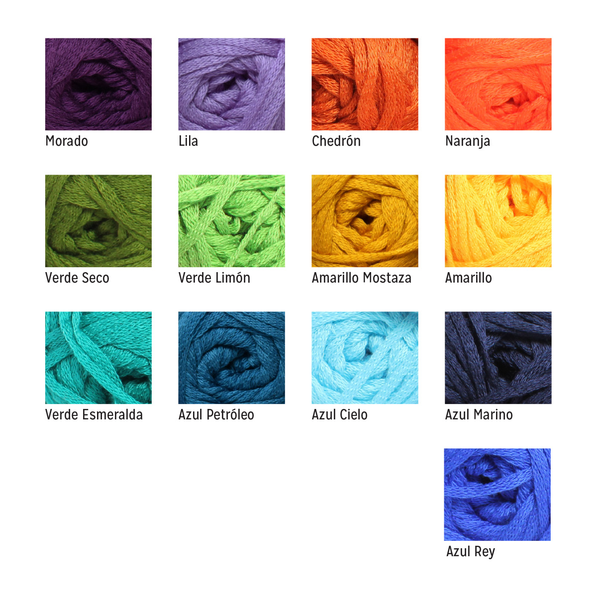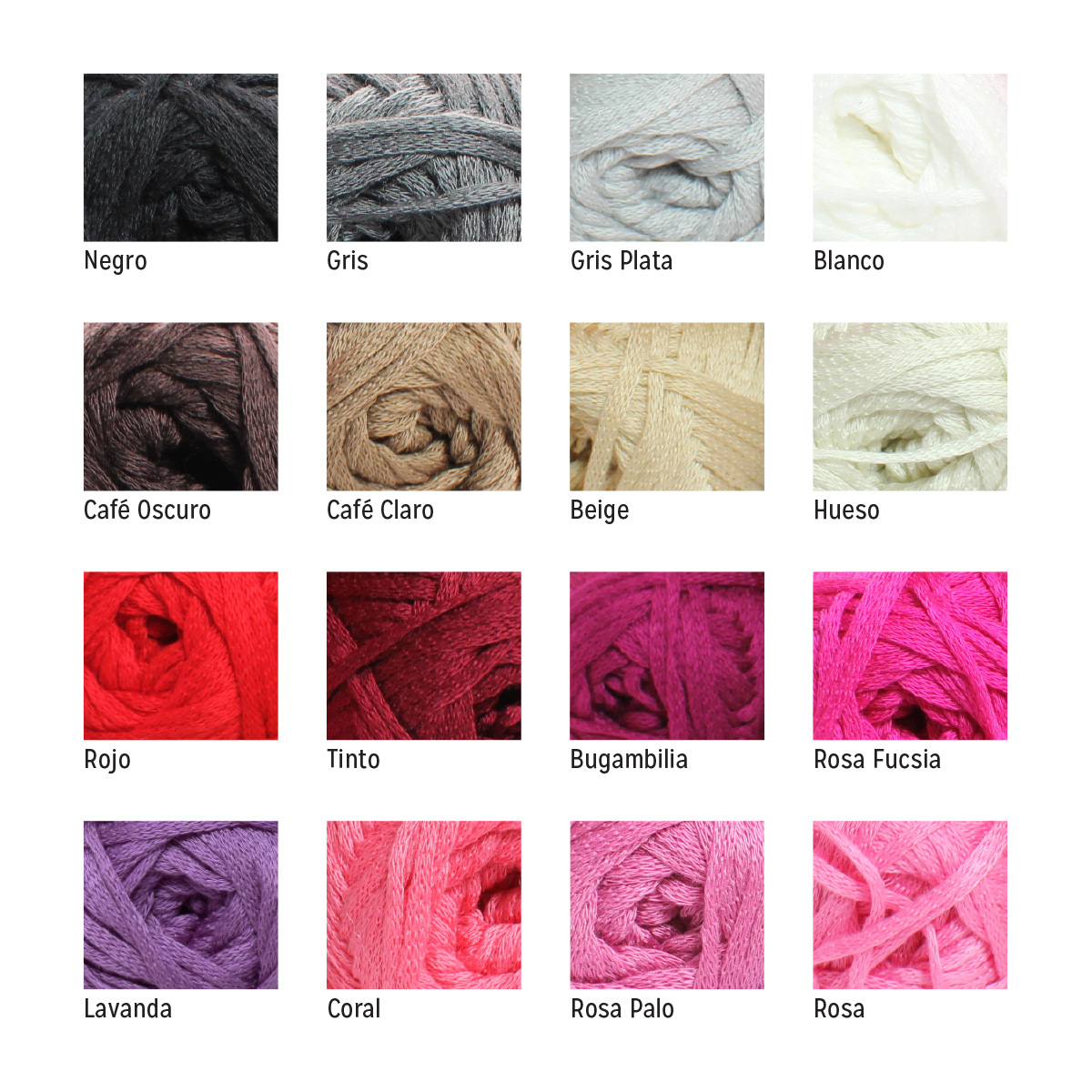 COLORES: NEGRO, GRIS, PLATA, BLANCO, HUESO, BEIGE, CAFÉ CLARO, CAFÉ OBS, ROJO, TINTO, BUGAMBILIA, FUCSIA, ROSA, ROSA PALO, CORAL, LAVANDA, MORADO, LILA, CHEDRON, NARANJA, AMARILLO, MOSTAZA, VERDE LIMON, VERDE SECO, VERDE ESMERALDA, PETROLEO, AZUL CIELO, AZUL MARINO Y AZUL REY. EMPAQUE INTERNO 10 PIEZAS. CARTON CON 200 PIEZAS. HECHO EN CHINA. MATERIAL: 100% ACRILICO. SE RECOMIENDAN AGUJAS DEL # 4.5 Y GANCHO DE ALUMINIO #4.5. APROXIMADAMENTE 100 METROS POR MADEJA
