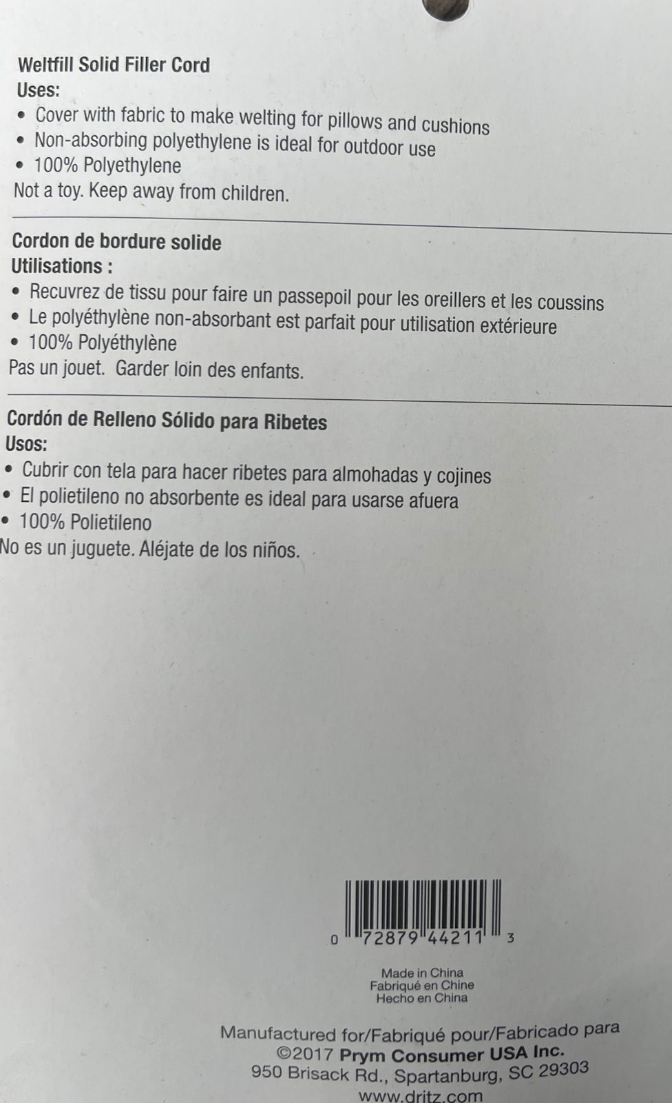 MATERIAL: 100% POLIETILENO. IDEAL PARA RIBETES DE COJINES Y ALMOHADAS. HECHO EN USA