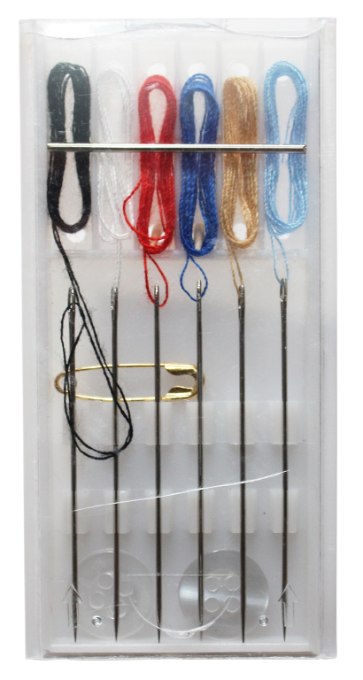 CONTIENE: 6 HEBRAS DE HILO, 1 SEGURO , 2 BOTONES Y 6 AGUJAS