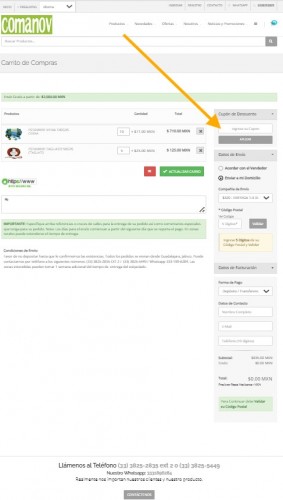 2) En el carrito o checkout, busca el campo “Cupón de descuento”.