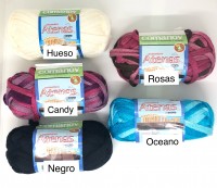 EMPAQUE INTERNO CON 5 PIEZAS. CARTON CON 75 PIEZAS. HECHO EN CHINA. MATERIAL: 100% ACRILICO. SE RECOMIENDAN AGUJAS DEL #3 Y GANCHO DE ALUMINIO #3. APROXIMADAMENTE 31 METROS POR MADEJA.
