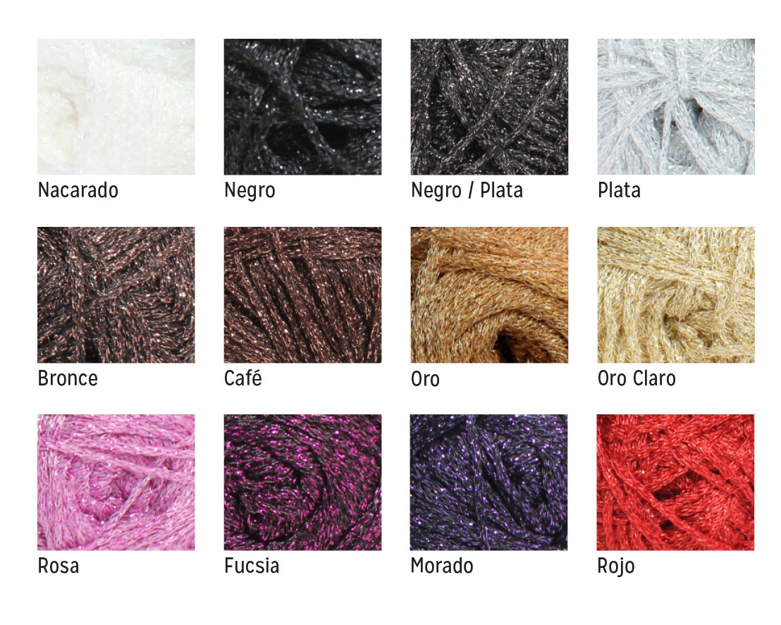 COLORES: NEGRO, CAFÉ, NEGRO-PLATA, BRONCE, MORADO, ROJO, FUCSIA, ROSA Y PLATA. EMPQUE INTERNO CON 10 PIEZAS. CARTON CON 100 PIEZAS. MATERIAL: 60% POLIESTER, 40% PET. HECHO EN CHINA. SE RECOMIENDAN AGUJAS DEL #3 Y GANCHO DE ALUMINIO #4. APROX 300 METROS POR MADEJA