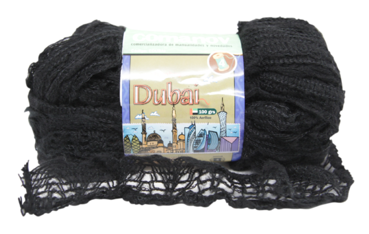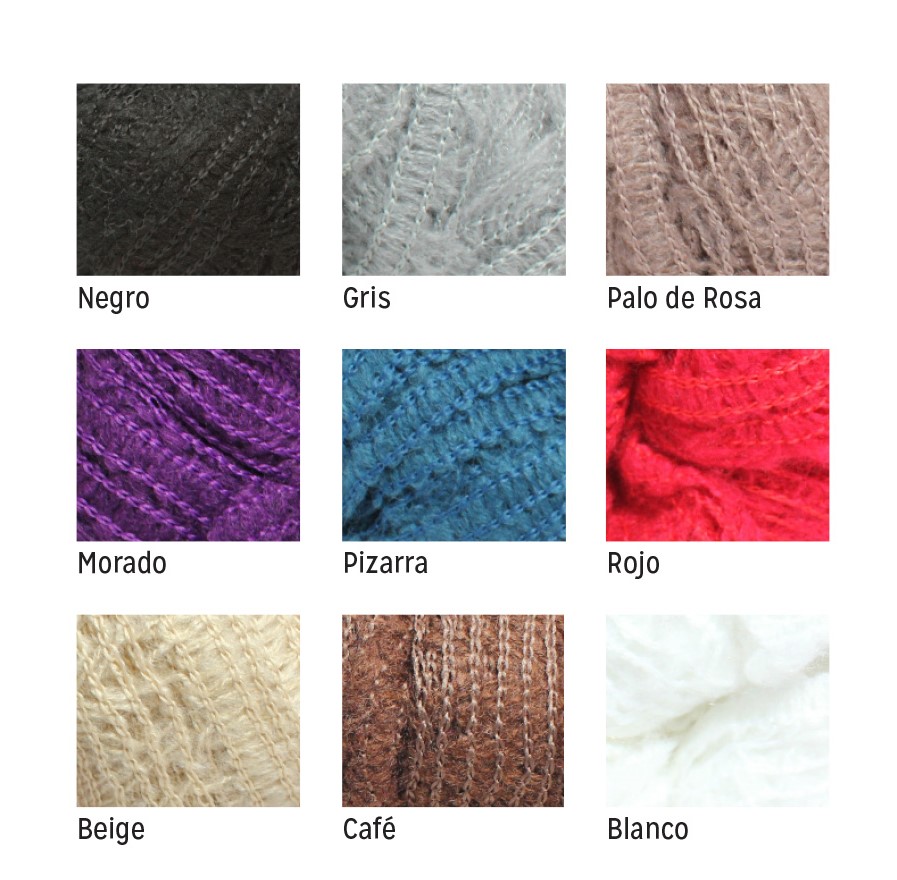 EMPAQUE INTERNO CON 5 PIEZAS. CARTON CON 75 PIEZAS. HECHO EN CHINA. MATERIAL: 100% ACRILICO. SE RECOMIENDAN AGUJAS DEL #7 Y GANCHO DE ALUMINIO #5. APROXIMADAMENTE 25 METROS POR MADEJA