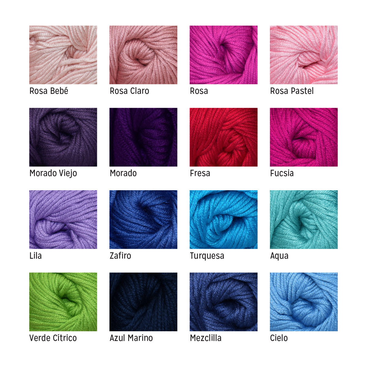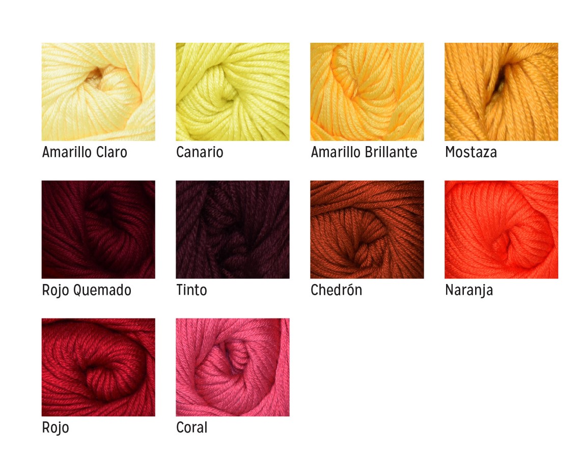 TOFFY, CHOCOLATE, CAFÉ OBS, ZAFIRO, AZUL TURQUESA, AQUA, AZUL CIELO, MEZCLAROILLA, AZUL MARINO, VEDE CLARO, CITRICO, HOJA, AMA CLARO, CANARIO, AMARILLO, TINTO, NARANJA, CHEDRON, ROJO QUEM, ROJO, LINO, NEGRO Y BLANCO. EMPAQUE INTERNO CON 5 PIEZAS. CARTON CON 100 PIEZAS. HECHO EN CHINA. MATERIAL: 100% ACRILICO. SE RECOMIENDAN AGUJAS DEL #4 Y GANCHO DE ALUMINIO #4.5