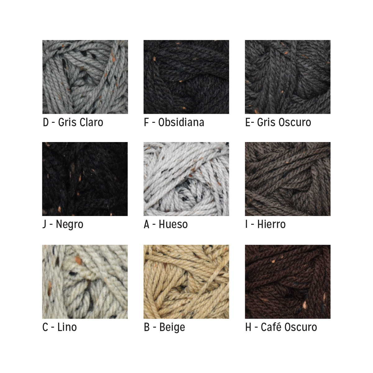 COLORES: D - GRIS CLARO, F - OBSID, E - GRIS OBS, J - NEGRO, A - HUESO, I - HIERRO, C - LINO, B - BEIGE Y H - CAFÉ. EMPAQUE INTERNO 5 PIEZAS. CARTON CON 100 PIEZAS