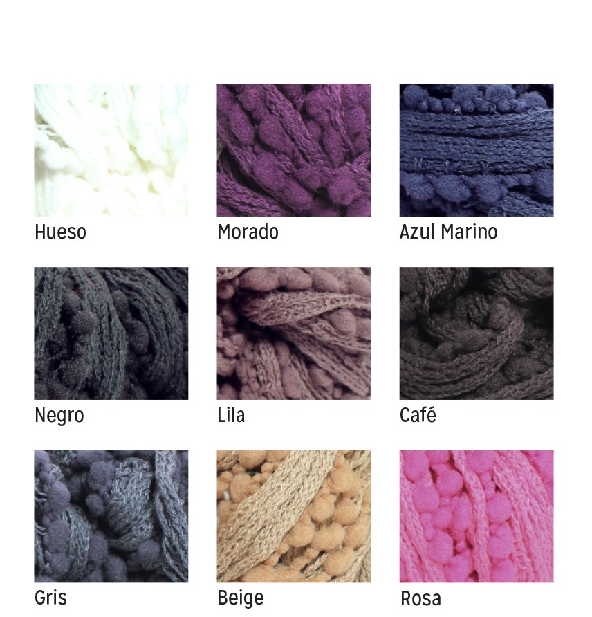 COLORES: HUESO, NEGRO, MORADO, LILA, AZUL MARINO, BEIGE, GRIS, ROJO, CAFÉ Y ROSA. EMPAQUE INTERNO CON 5 PIEZAS. CARTON CON 75 PIEZAS. HECHO EN CHINA. MATERIAL: 100% POLIESTER. SE RECOMIENDAN AGUJAS DEL #8 Y GANCHO DE ALUMINIO #8. APROXIMADAMENTE 21 METROS POR MADEJA