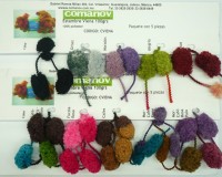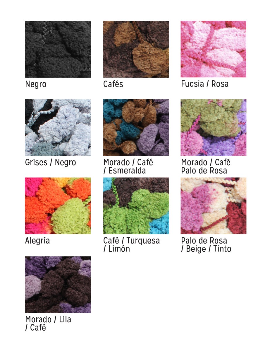 COLORES: NEGRO, GRISES, MORADOS, CAFES, ALEGRIA, VERDE ESMERALDA, ROSA PALO, AZUL TURQUESA, FUCSIA Y ROSAS. EMPAQUE INTERNO CON 5 PIEZAS. CARTON CON 75 PIEZAS. HECHO EN CHINA. MATERIAL: 100% POLIESTER. SE RECOMIENDAN AGUJAS DEL #5 Y GANCHO DE ALUMINIO #5