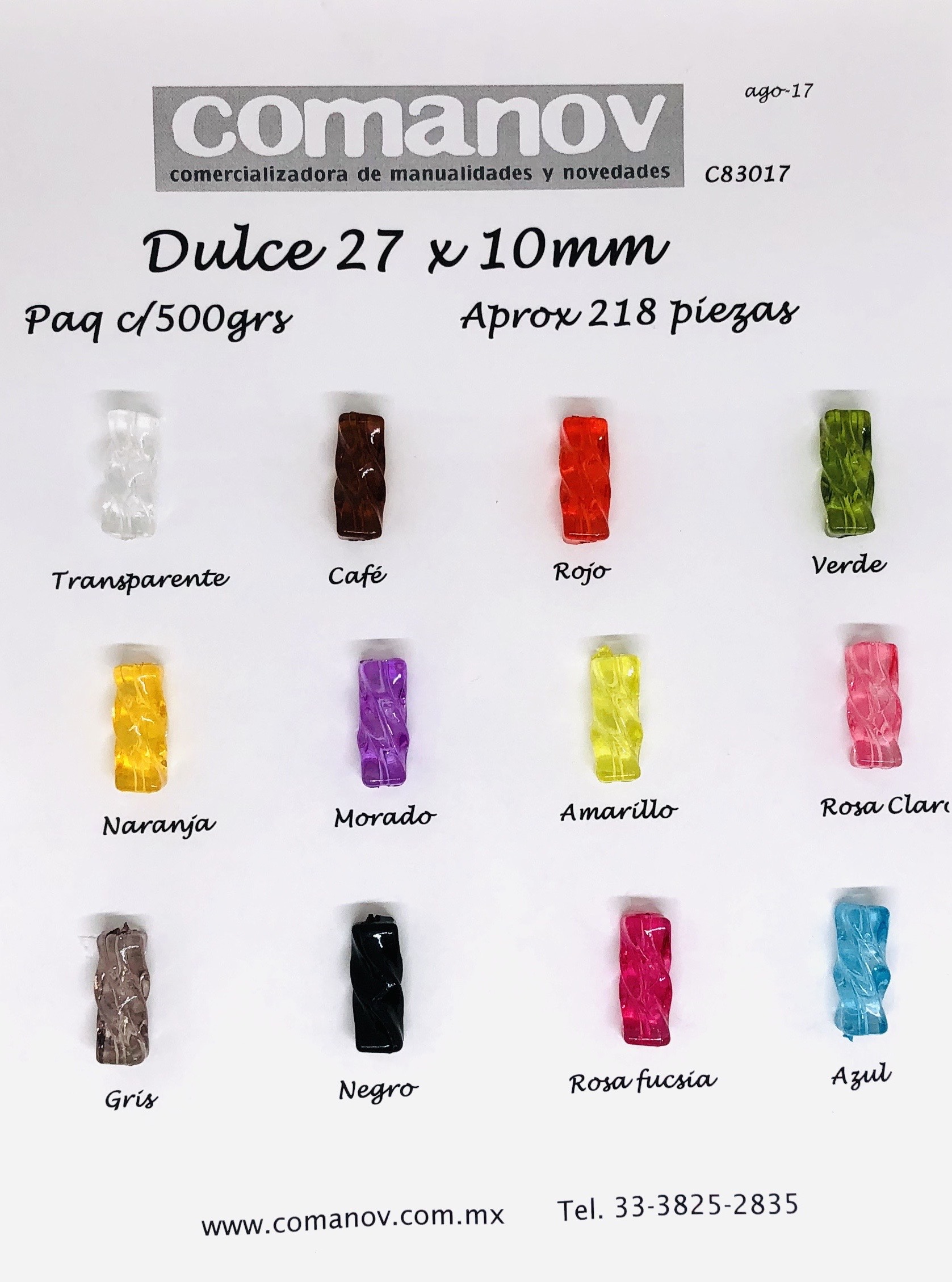 COLORES: TRANSP, CAFÉ, ROJO, VERDE, NARANJA, MORADO, AMARILLO, ROSITA, GRIS, NEGRO, FUCSIA Y AZUL. APROXIMADAMENTE 218 PIEZAS EN 500GR. CARTON CON 20 BOLSAS DE 500GR.