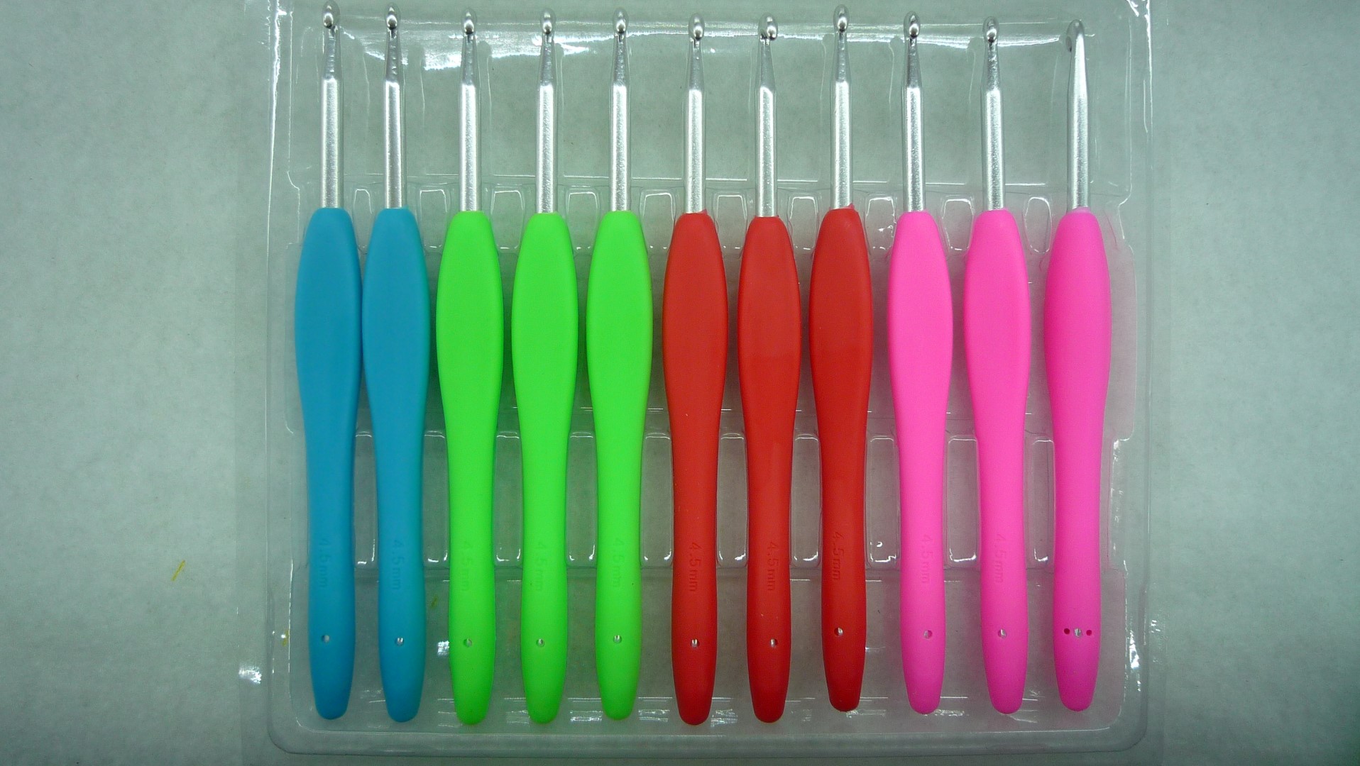 RECOMENDADO PARA QUIEN TEJE DURANTE MUCHO TIEMPO O QUE APRIETA MUCHO EL GANCHO AL TEJER. LOS COLORES PUEDEN VARIAR. EMPAQUE INTERNO: 11 PIEZAS. CARTON: 100 PAQUETES