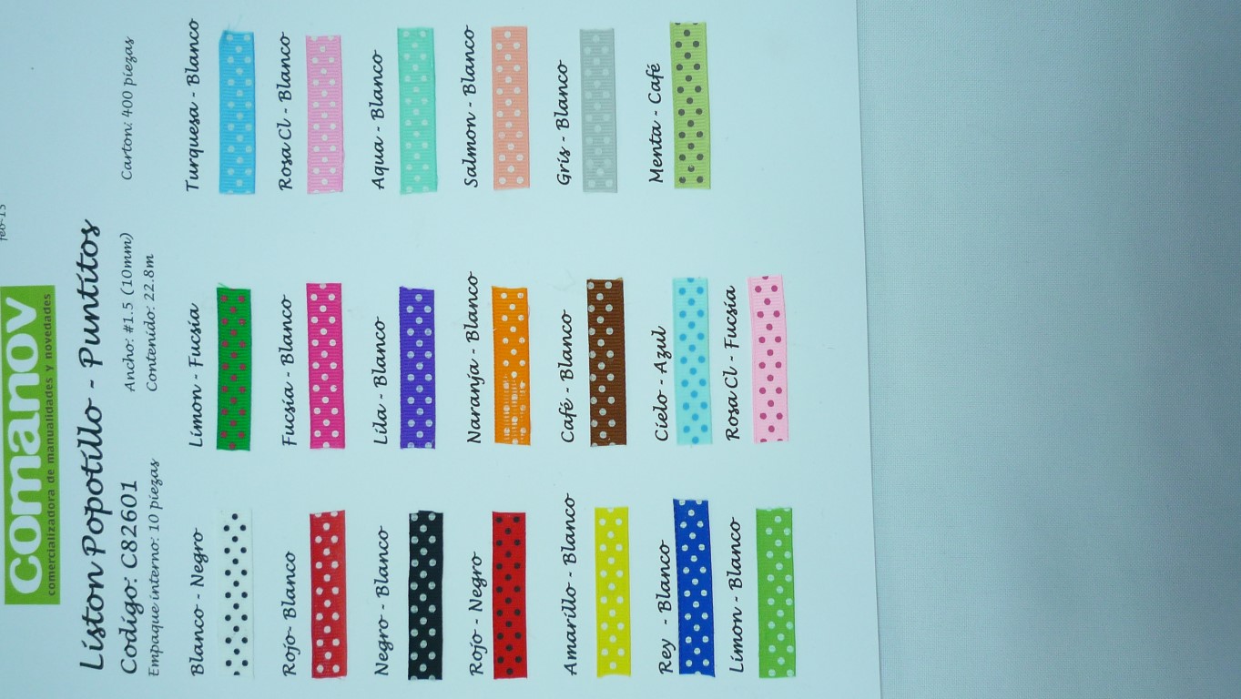 COLORES: BLANCO - NEGRO, ROJO- BLANCO, NEGRO - BLANCO, ROJO - NEGRO, AMARILLO - BLANCO, AZUL REY - BLANCO, VERDE LIMON - BLANCO, VERDE LIMON - FUCSIA, FUCSIA - BLANCO, LILA - BLANCO, NARANJA - BLANCO, CAFÉ - BLANCO, AZUL CIELO - AZUL, ROSA CLARO - FUCSIA, AZUL TURQUESA - BLANCO, ROSA CLARO - BLANCO, AQUA - BLANCO, SALMON - BLANCO, GRIS - BLANCO Y MENTA - CAFÉ. EMPAQUE INTERNO CON 10 ROLLOS. CARTON CON 400 ROLLOS.