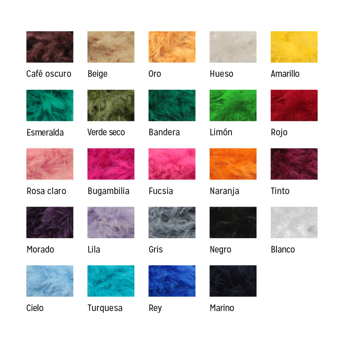 COLORES: AMARILLO, AZUL CIELO, AZUL MARINO, AZUL REY, AZUL TURQUESA, BEIGE, BLANCO, BUGAMBILIA, CAFÉ, DORADO, GRIS, HUESO, LILA, MORADO, NARANJA, NEGRO, ROJO, ROSA CLARO, ROSA FUCSIA, UVA, VERDE BANDERA, VERDE LIMON Y VERDE SECO. LONGITUD 1.80 METROS. DEBIDO A QUE VIENEN EMPACADAS APRETADAS EN LA BOLSA, AL SACARLAS SE VEN DELGADAS Y SE RECOMIENDA QUE SE DEJEN COLGANDO UN DIA PARA QUE SE ESPONJEN. EMPAQUE INTERNO CON 10 TIRAS DE PLUMAS. CARTON CON 2000 TIRAS DE PLUMAS