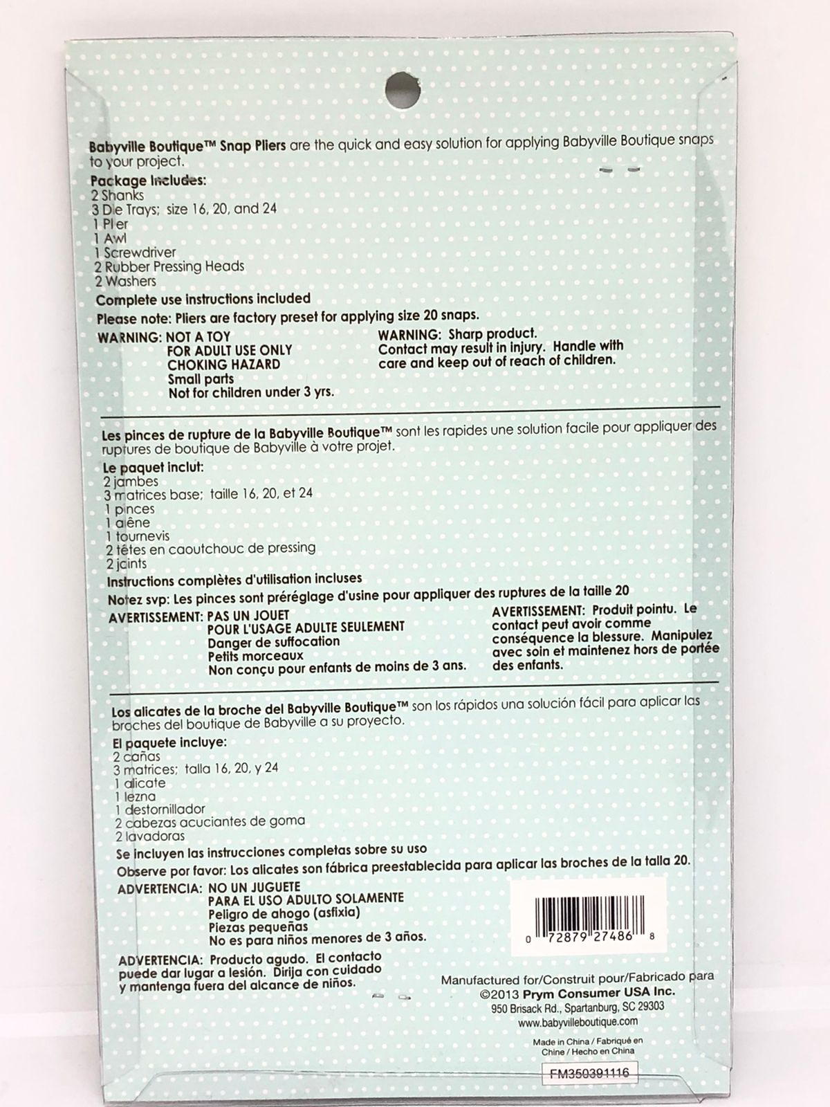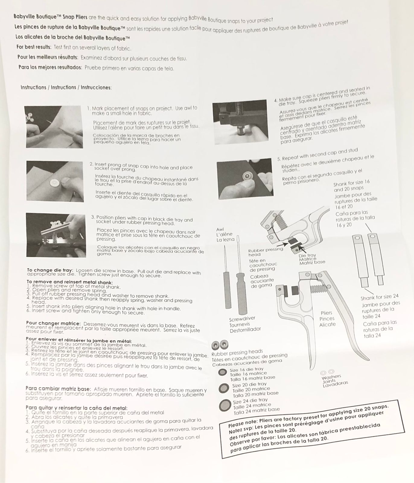 INCLUYE: 1 PINZA, 2 TUBOS, 3 DADOS (TALLA 16, 20 Y 24), 1 PUNZON, 1 DESTORNILLADOR, 2 CABEZAS DE GOMA, 2 LIMPIADORAS. ESTA ARMADO DE FABRICA PARA APLICAR BROCHES #20. SE VENDEN POR SEPARADO LOS BROCHES CON EL CODIGO C49031
