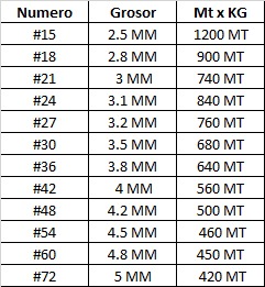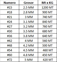 COLOR: NATURAL. CARTON: 30KG. LOS METROS EXPRESADOS EN LA TABLA SON LINEALES POR LO QUE DEBE DE CONSIDERAR QUE LOS METROS TORCIDOS SERAN DISTINTOS, ESTO VARIA DEPENDE LA DE TORSION DE CADA ROLLO Y EL CALIBRE.