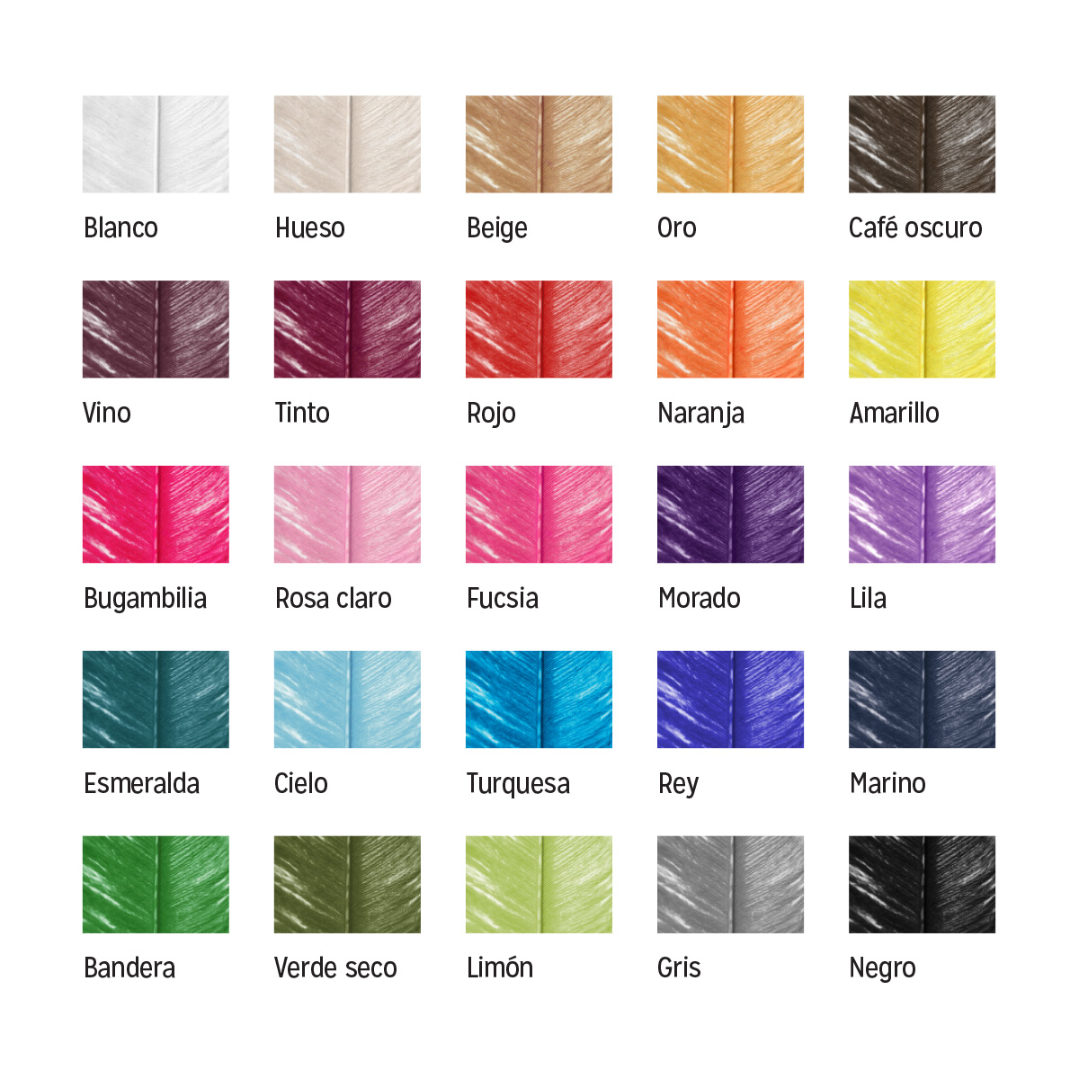 COLORES: AMARILLO, AMARILLO ORO, AZUL MARINO, AZUL CIELO, AZUL REY, AZUL TURQUESA, BEIGE, BLANCO, BUGAMBILIA, CAFÉ, DORADO, GRIS, HUESO, LILA, MORADO, NARANJA, NEGRO, ROJO, ROSA CLARO, ROSA FUCSIA, VERDE BANDERA, VERDE ESMERARLDA, VERDE LIMON, VERDE SECO Y VINO. DEBIDO A QUE SON PLUMAS DE ANIMAL TEÑIDA CADA UNA ES DISTINTA. EMPAQUE INTERNO CON 10 PLUMAS. CARTON CON 2000 PLUMAS