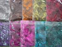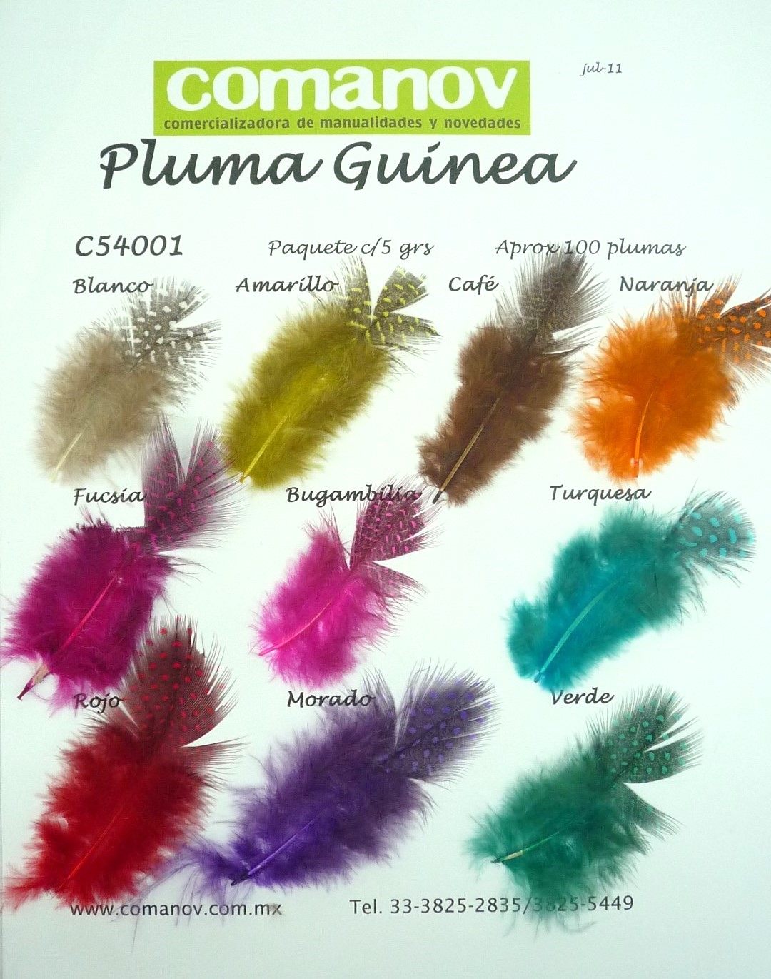 COLORES: AMARILLO, AZUL TURQUESA, BLANCO, BUGAMBILIA, CAFÉ, MORADO, NARANJA, ROJO, FUCSIA Y VERDE ESMERALDA. CONTENIDO APROXIMADO POR PAQUETE 110 PLUMAS. DEBIDO A QUE SON PLUMAS DE ANIMAL TEÑIDA CADA UNA ES DISTINTA.